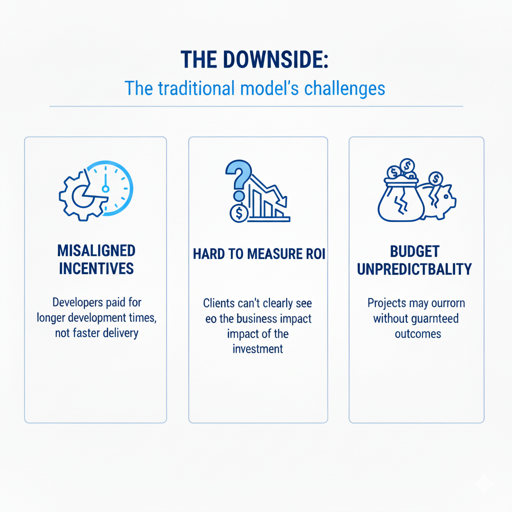 - Misaligned incentives: Developers may get paid for longer development times, not faster delivery.